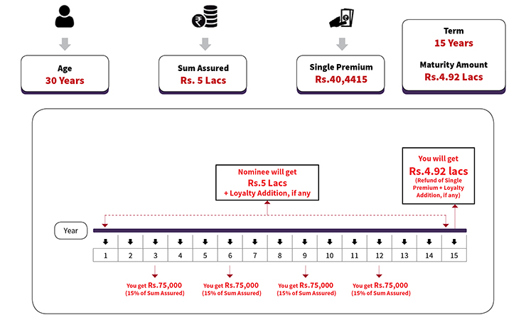 - This plan offers Guaranteed 15% of Sum Assured at regular intervals depending on the term of the policy that customer choose