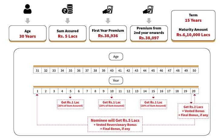 - This plan offers guaranteed tax-free 20% of Sum Assured in 5th, 10th & 15th Year of the policy. The premium payment term in this plan is 15 years.