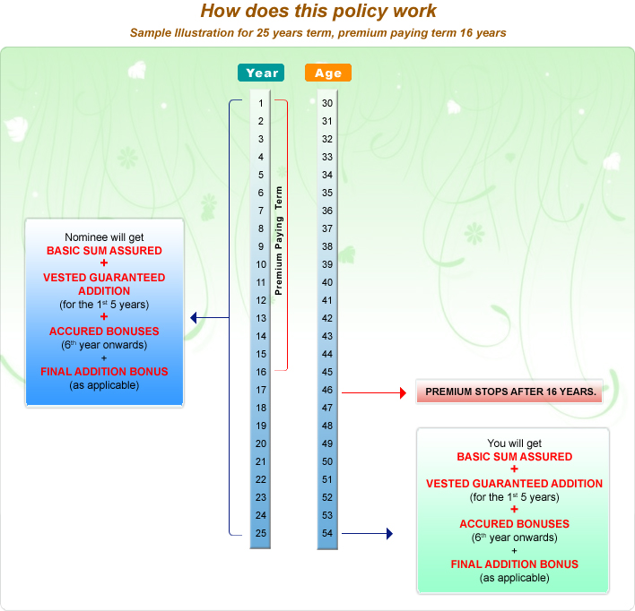 - Life Cover from 6th year onwards: Sum Assured +Guaranteed Additions for the 1st 5 years + accrued bonuses declared from 6th year onwards + Final Addition Bonus (as applicable)