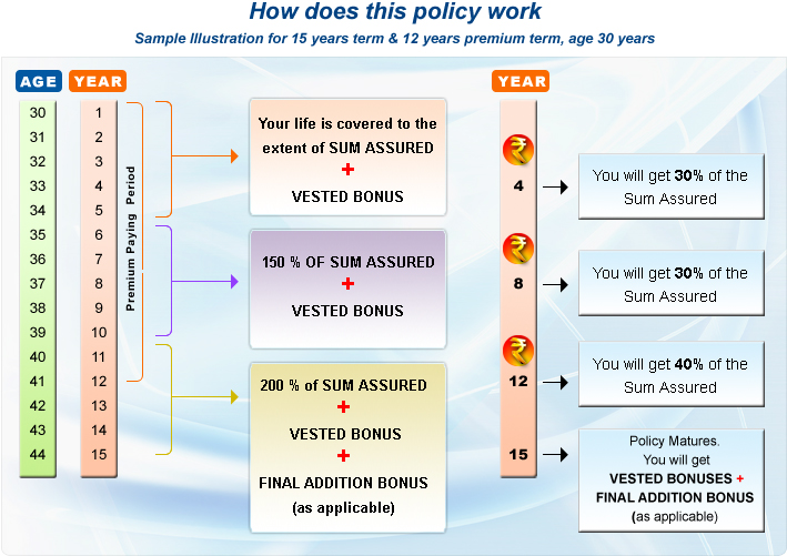 - The life cover starts with Sum Assured + Accrued Bonus. It grows by 50 % of Sum Assured every 5 years thereby providing greater protection with increasing responsibilities.