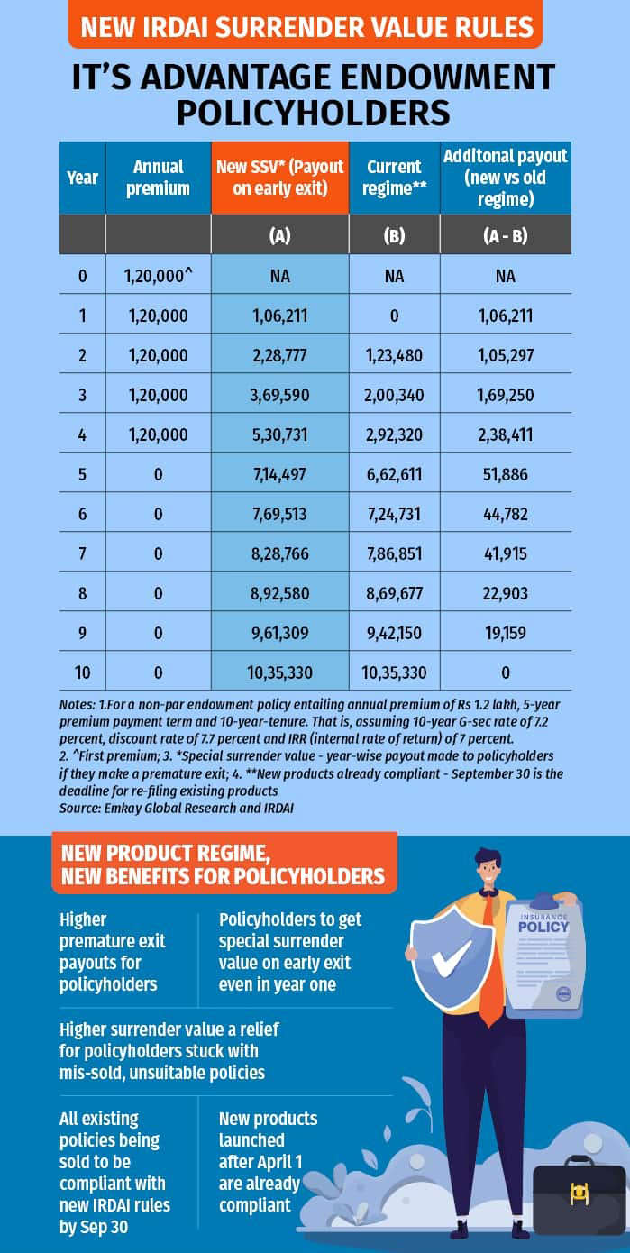 Policyholders stuck with IRDAI's product, special surrender value rules will get higher premium refund on early exit Come October, and the new higher-payouts-on-early-exit regime will commence in the life insurance space. This is part of the larger, updated insurance product regulations issued by the Insurance Regulatory and Development Authority of India (IRDAI) in March, followed by the master circular with detailed norms in June. While the rules were already applicable to new products launched since then, the regulator had granted life insurance companies time till September 30 to re-file their existing plans to comply with the new norms.